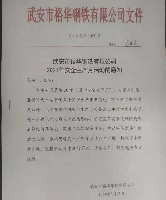 今年6月是第20个全国“安全生产月”,为深入贯彻落实习近平总书记关于安全生产重要论述,牢固树立安全发展理念,扎实推进安全生产专项整治三年行动集中攻坚,进一步强化红线意识和底线思维,切实把各类事故风险隐患消除在萌芽阶段,突出“落实安全责任,推动安全发展”的活动主题,全力维护安全生产形势持续稳定,为庆祝建党百年营造良好环境,6月1日,裕华钢铁“2021年安全月启动大会”在公司能源三楼会议室召开。